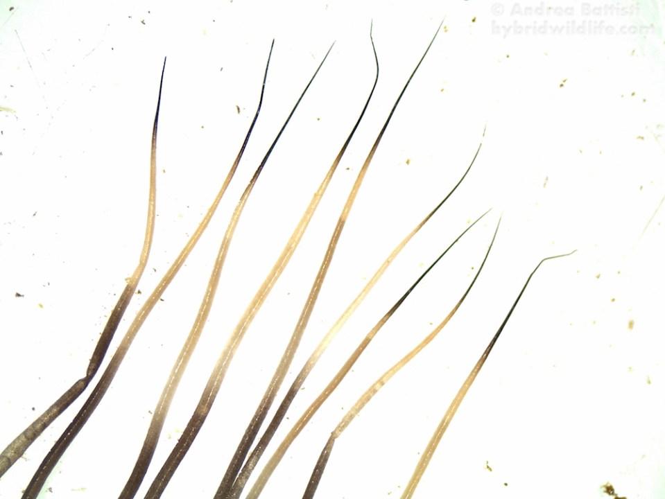 Colore scuro, sezione circolare e una banda chiara prima della punta fine, si tratta di pelo invernale di capriolo, gli ungulati sono tra le prede più consumate nella stagione invernale – Stereoscope Leica EZ4D, LAS EZ 3.0